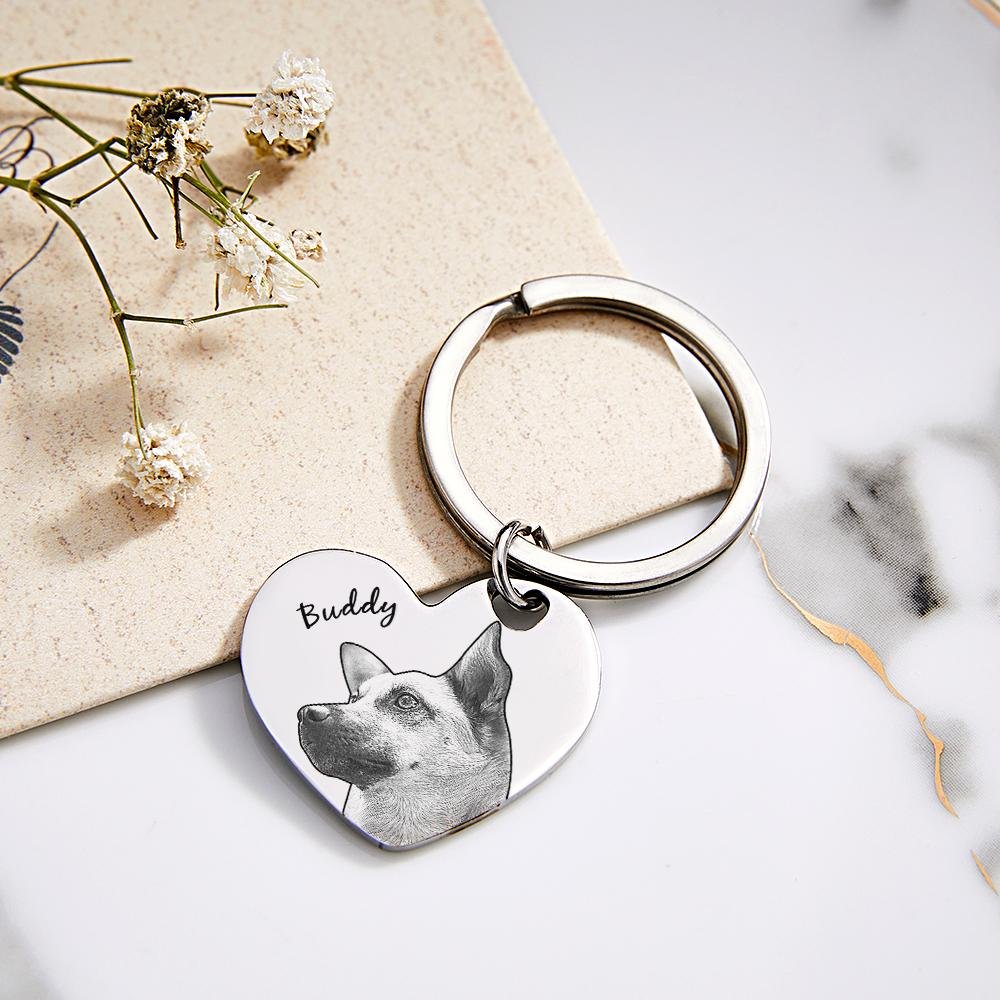 Custom Pet Portrait Heart Keychain, Personalized Name Engraved Keyring, Unique Keepsake for Pet Lovers, Memorial Gift for Pets