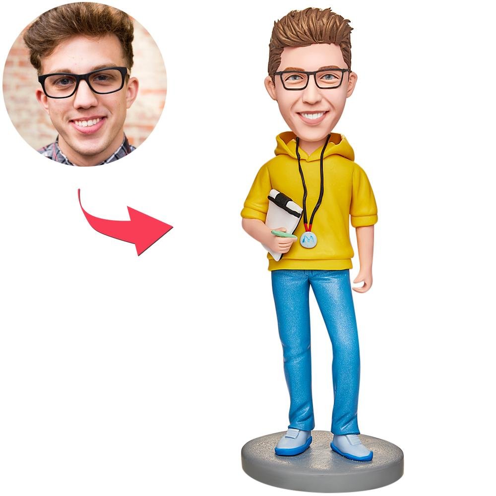 This custom bobblehead figurine is a fun and creative way to turn yourself or someone you love into a clay mini figure. 🧱 First, we use your photo to shape the face and capture key features. Then, the body follows the ready-made design shown in the product images. As a result, the figurine feels personal while also keeping a neat and balanced look. In addition, it is a great choice for gifts, memories, and display.