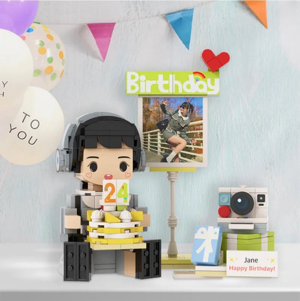 The Custom Brick Birthday Figure is a personalized 1-person brick figure with photo and name, perfect for birthday gifts and special milestones.