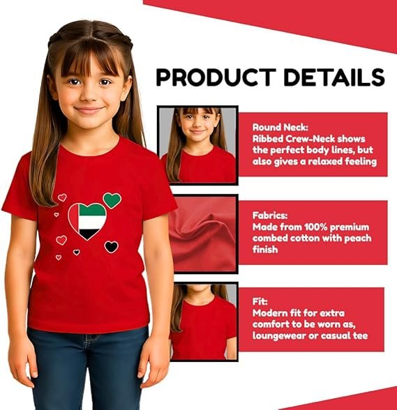 Celebrate UAE pride with this UAE Round Neck T-Shirt for Girls, made from soft cotton fabric for ultimate comfort and everyday style. Perfect for school, events, or casual outings.