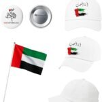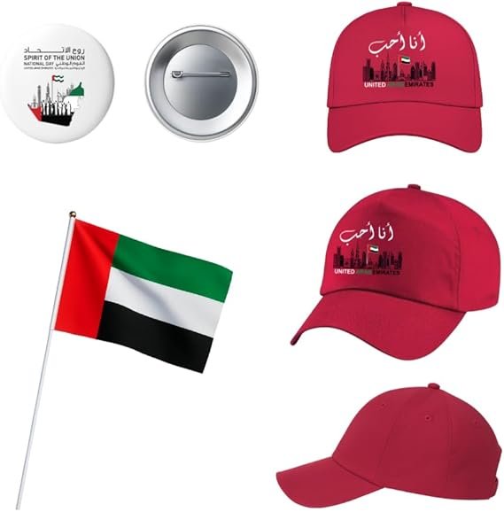 Celebrate UAE pride with the UAE National Day Combo Pack for Kids, featuring a baseball cap, button badge, and handheld flag — perfect for school events, parades, and National Day celebrations.